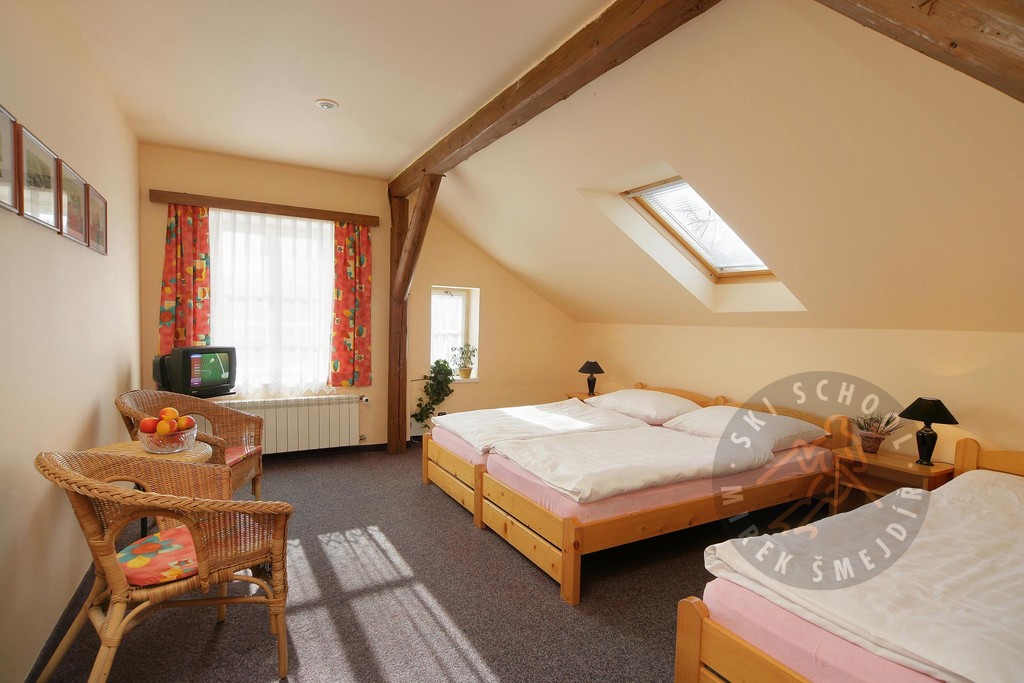 Ośrodek narciarski Mirek Šmejdíř oferuje zakwaterowanie w komfortowych pokojach dwu oraz trzyosobowych z własną łazienką i toaletą. W całym pensjonacie jest do dyspozycji połączenie wi-fi. Każde rano przygotowujemy dla Was bogate śniadanie. Jeżeli samemu będziesz chciał przygotowywać śniadanie, masz do dyspozycji wspólną kuchnię z wszelkim wyposażeniem. Wieczór możesz posiedzieć z przyjaciółmi w naszym pokoju klubowym, w lecie zaś w ogrodzie wyposażonym w grill ogrodowy.